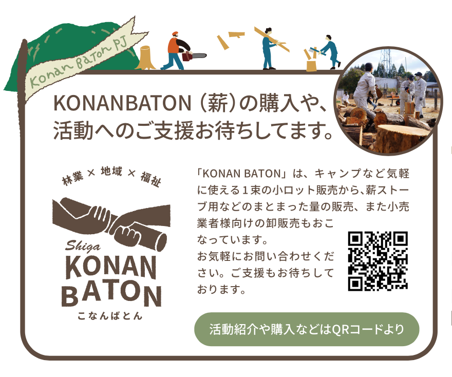 このイベントは、滋賀県湖南市の間伐材(森林の保育・保全のための伐採で出てきた木材)の利活用を促進するプロジェクト『KONAN BATON』の、年に一度のイベントとして企画されました。